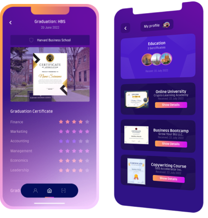 The Bonuz app allows for the issuance of non-transferable, blockchain-based certificates to verify educational achievements and credentials for both students and teachers. This not only enhances the credibility and value of the educational institution, but also allows for streamlined verification processes for employers and other organizations. Additionally, this benefits online universities and other distance learning programs, as it provides a secure and tamper-proof method for verifying educational qualifications.